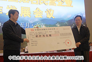 踐行光彩精神,助力老區(qū)發(fā)展。2013年5月9日上午,由中國光彩事業(yè)促進會、中華全國工商業(yè)聯(lián)合會與安徽省人民政府聯(lián)合舉辦的“中國光彩事業(yè)六安行暨安徽省與全國知名民營企業(yè)合作發(fā)展會議”在安徽省六安市召開。本次大會旨在光大光彩事業(yè)、搭建合作平臺,推進大別山片區(qū)扶貧攻堅,深化安徽與全國知名民營企業(yè)合作。會上,中國光彩事業(yè)促進會現(xiàn)場向金寨縣捐贈2000萬元,全省各地市與多家企業(yè)現(xiàn)場集中簽約項目228個,投資規(guī)模3485億元。