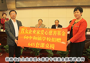 會(huì)議現(xiàn)場(chǎng),省工商聯(lián)扶貧處處長(zhǎng)甘露與省工商聯(lián)女企業(yè)家商會(huì)會(huì)長(zhǎng)吳建平簽署協(xié)議,成立了湖南省光彩事業(yè)基金會(huì)女企業(yè)家愛心慈善專項(xiàng)基金,并向?yàn)g陽市中和鎮(zhèn)學(xué)校捐贈(zèng)645套課桌椅。