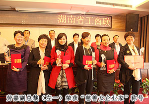 2013年3月27日,湖南省工商聯(lián)女企業(yè)家商會(huì)四屆三次理事會(huì)暨2012年度“慈善女企業(yè)家”表彰會(huì)在長(zhǎng)沙召開。一大批優(yōu)秀團(tuán)體會(huì)員和優(yōu)秀個(gè)人會(huì)員受到表彰,湖南省工商聯(lián)(總商會(huì))女商會(huì)副會(huì)長(zhǎng)、綠之韻集團(tuán)董事常務(wù)副總裁勞嘉榮獲“慈善女企業(yè)家”榮譽(yù)稱號(hào)。同時(shí),會(huì)上成立了湖南省光彩事業(yè)基金會(huì)女企業(yè)家愛心慈善專項(xiàng)基金。湖南省副省長(zhǎng)、省工商聯(lián)主席何報(bào)翔,湖南省人大常委會(huì)原副主任顏永盛,中共湖南省委統(tǒng)戰(zhàn)部副部長(zhǎng)、省工商聯(lián)黨組書記、省非公經(jīng)濟(jì)組織黨工委書記湯新華,省工商聯(lián)副主席史雪華等領(lǐng)導(dǎo)出席會(huì)議,并為獲獎(jiǎng)代表頒獎(jiǎng)。