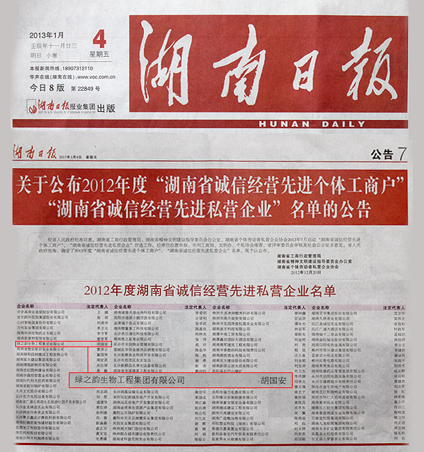2013年1月4日上午,湖南省工商行政管理局、湖南省精神文明建設(shè)指導(dǎo)委員會辦公室、湖南省個體勞動者私營企業(yè)協(xié)會聯(lián)合召開新聞通報會,公布“2012年度湖南省誠信經(jīng)營先進個體工商戶”和“2012年度湖南省誠信經(jīng)營先進私營企業(yè)”名單。湖南省工商局黨組書記、局長李金冬出席會議并通報評選活動開展情況;省文明辦副主任周孟霞宣讀誠信經(jīng)營先進個體工商戶名單;省工商局總會計師、省個私協(xié)會常務(wù)副會長、評審委員會主任張其術(shù)宣讀誠信經(jīng)營先進私營企業(yè)名單。會議由省工商局黨組副書記、副局長寇勇主持。綠之韻集團董事、常務(wù)副總裁勞嘉等先進誠信經(jīng)營單位代表以及省工商局有關(guān)部門負責人參加通報會。