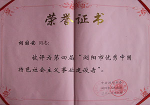 為表彰非公經(jīng)濟(jì)人士為瀏陽市經(jīng)濟(jì)社會發(fā)展做出的重要貢獻(xiàn),2012年10月13日上午,瀏陽市第四屆“優(yōu)秀中國特色社會主義事業(yè)建設(shè)者”頒獎(jiǎng)儀式在瀏陽市政東廣場隆重舉行。中共瀏陽市委副書記、市長曹立軍,長沙市政協(xié)副主席、市工商聯(lián)主席彭繼球等領(lǐng)導(dǎo)出席頒獎(jiǎng)儀式。會上,綠之韻集團(tuán)董事長胡國安被中共瀏陽市委、市政府授予第四屆“瀏陽市優(yōu)秀中國特色社會主義事業(yè)建設(shè)者”榮譽(yù)稱號。