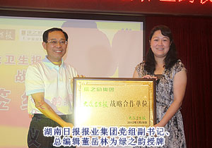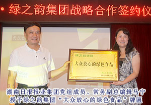 簽約儀式由湖南日報報業(yè)集團黨組成員、副總編輯盛忠主持。會上,湖南日報報業(yè)集團黨組副書記、總編輯董岳林為綠之韻集團授予“大眾衛(wèi)生報?綠之韻集團戰(zhàn)略合作單位”牌匾。湖南日報報業(yè)集團黨組成員、常務副總編輯馬寧授予綠之韻集團“大眾放心的綠色食品”牌匾,綠之韻集團董事常務副總裁勞嘉代表集團接受牌匾。