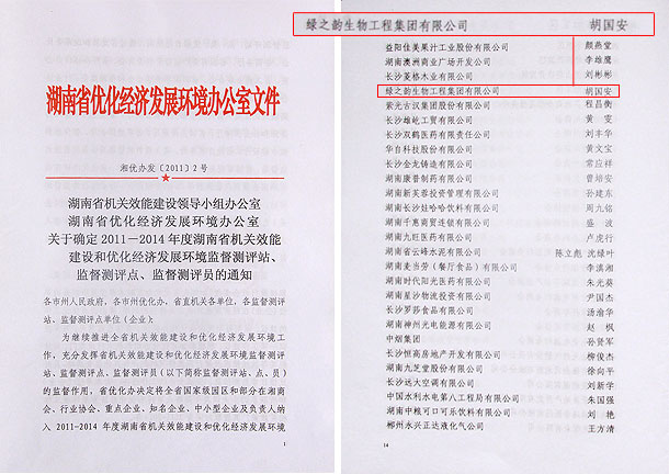 2012年2月7日,由湖南省委省政府、省紀(jì)委、省監(jiān)察廳、省優(yōu)化辦聯(lián)合組織的湖南省機(jī)關(guān)效能建設(shè)和優(yōu)化經(jīng)濟(jì)發(fā)展環(huán)境監(jiān)督測(cè)評(píng)站點(diǎn)員工作會(huì)議在湖南賓館成功召開。中共湖南省委常委、省紀(jì)委書記黃建國(guó)、湖南省人民政府副省長(zhǎng)何報(bào)翔等出席會(huì)議。會(huì)議期間聘請(qǐng)了新一屆監(jiān)督測(cè)評(píng)站、點(diǎn)、員,綠之韻集團(tuán)受聘為監(jiān)督測(cè)評(píng)點(diǎn),胡國(guó)安董事長(zhǎng)受聘為監(jiān)督測(cè)評(píng)員,在2011—2014年間,將全面參與對(duì)全湖南省機(jī)關(guān)效能建設(shè)和優(yōu)化經(jīng)濟(jì)發(fā)展環(huán)境的監(jiān)督測(cè)評(píng)。