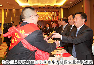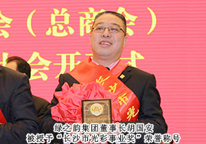 2011年12月23日,長沙市工商聯(lián)(總商會)第十三次會員代表大會在長沙隆重召開。中共湖南省委常委、長沙市委書記陳潤兒,中共長沙市委副書記、市長張劍飛,中共長沙市委常委、市委統(tǒng)戰(zhàn)部部長文樹勛,湖南省委統(tǒng)戰(zhàn)部副部長、省工商聯(lián)黨組書記崔永平等省市各級領(lǐng)導(dǎo)出席會議。作為長沙市工商聯(lián)(總商會)副主席,綠之韻集團(tuán)董事長胡國安憑借多年來率領(lǐng)企業(yè)積極響應(yīng)并參與 “萬企聯(lián)村、共同發(fā)展”、情系“三區(qū)”,感恩社會光彩大行動等活動取得的成績,榮獲由長沙市委統(tǒng)戰(zhàn)部、市工商聯(lián)聯(lián)合頒發(fā)的“長沙市光彩事業(yè)獎”。