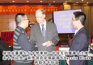 為落實(shí)周強(qiáng)書記在北京出席中美州長(zhǎng)對(duì)話會(huì)議關(guān)于“開創(chuàng)中美省州地方合作新未來”的精神,推進(jìn)湖南與北卡州簽訂的友好省州協(xié)議內(nèi)容,促進(jìn)湖南與北卡州全面開展民間經(jīng)濟(jì)外交,2011年10月20日下午,長(zhǎng)沙—美國(guó)中小企業(yè)合作周(長(zhǎng)沙)項(xiàng)目對(duì)接洽談會(huì)在華天大酒店召開,由卡羅萊納—中國(guó)友協(xié)董事會(huì)主席,北卡州議員,原美國(guó)農(nóng)業(yè)部副部長(zhǎng)Harris Blake為團(tuán)長(zhǎng)率領(lǐng)的美國(guó)北卡經(jīng)貿(mào)及友好交流訪問團(tuán)成員來長(zhǎng)與長(zhǎng)沙企業(yè)家對(duì)接洽談。長(zhǎng)沙市政協(xié)副主席、市工商聯(lián)主席彭繼球,市僑聯(lián)副主席翁少蘭等領(lǐng)導(dǎo)出席了對(duì)接洽談。繼九月訪美赴北卡州考察與美方企業(yè)有過初步對(duì)接后,此次綠之韻集團(tuán)胡國(guó)安董事長(zhǎng)再次應(yīng)邀出席合作洽談會(huì)并對(duì)北卡州龐達(dá)地產(chǎn)總裁Mark Herman想建第一座中國(guó)城的項(xiàng)目積極關(guān)注。