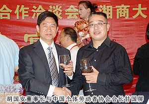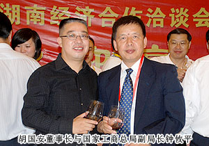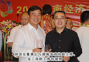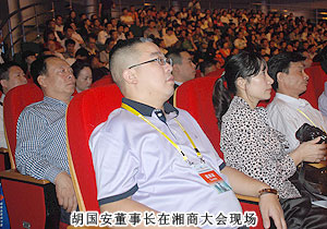 2011年9月28日,2011湖南省經(jīng)濟合作洽談會暨湘商大會在衡陽隆重召開,來自國內23個省的54個代表團、42家各地商會的3000余名代表共赴盛會。全國政協(xié)原副主席毛致用、中共湖南省委常委、常務副省長于來山、國家工商總局副局長鐘攸平,中國個體勞動者協(xié)會會長甘國屏、湖南省政協(xié)副主席、省工商聯(lián)主席何報翔等各級領導出席開幕式。應湖南省工商聯(lián)、衡陽市人民政府的邀請,中國青年企業(yè)家協(xié)會常務理事、湖南省青年企業(yè)家協(xié)會副會長、2009中國十大杰出湘商、綠之韻集團董事長胡國安出席大會。