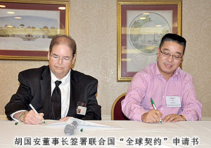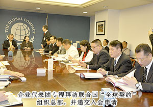 考察過程中,企業(yè)家代表團(tuán)一行專程拜訪了聯(lián)合國“全球契約”組織總部,與聯(lián)合國“全球契約”總干事喬治?科爾進(jìn)行了友好、親切的會見。綠之韻集團(tuán)、楚天科技、佳樂實業(yè)等湖南省15家民營企業(yè)現(xiàn)場向該組織遞交了入會申請?!叭蚱跫s”是一種思路和價值觀,由前聯(lián)合國秘書長安南首倡議,潘基文秘書長繼續(xù)推動。該契約旨在鼓勵全球企業(yè)與聯(lián)合國機構(gòu)、勞工組織和民間團(tuán)體一起,共同尋找克服全球化負(fù)面影響的途徑。加入該組織的單位必須在遵守人權(quán)、勞動標(biāo)準(zhǔn)、環(huán)境保護(hù)等方面率先垂范。