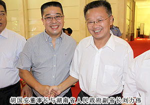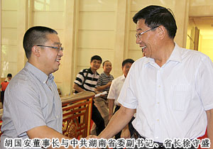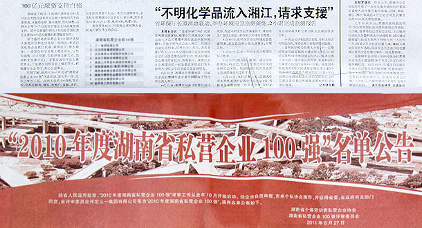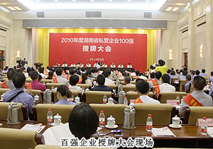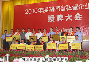 2011年8月16日,湖南省私營企業(yè)100強授牌大會在長沙隆重舉行。中共湖南省委副書記、省長徐守盛、中國個體勞動者協(xié)會會長甘國屏、省人民政府副省長劉力偉、湖南省人大常委會副主任陳叔紅、湖南省政協(xié)副主席、省工商聯(lián)會長何報翔等省市領導出席頒獎儀式。綠之韻集團作為湖南省重點企業(yè),榮耀晉升“2010年度湖南省私營企業(yè)100強”行列,胡國安董事長應邀出席頒獎儀式,得到了省市各級領導的肯定和贊許。
