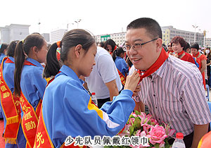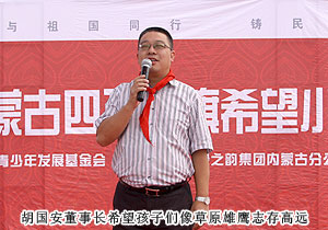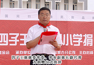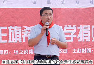 捐贈(zèng)儀式現(xiàn)場,上百名綠之韻愛心精英共舞《中國人》,昂揚(yáng)的氣勢,莊嚴(yán)的氛圍震撼全場。因?yàn)橥侵袊?,同在藍(lán)天下,所以我們更要像孟子所希望的一樣“老吾老以及人之老,幼吾幼以及人之幼”,奉獻(xiàn)自己力所能及的愛心,為社會(huì)輸送溫暖,讓感動(dòng)在每一個(gè)人的心中升溫。少先隊(duì)員為蒞臨現(xiàn)場的領(lǐng)導(dǎo)和嘉賓敬獻(xiàn)紅領(lǐng)巾,那一抹鮮紅代表著光榮,代表著感恩,它在每一位愛心人士的胸前飄揚(yáng),讓綠之韻人的責(zé)任更加重大。四子王旗常委、常務(wù)副旗長蔚代青致歡迎辭,對綠之韻集團(tuán)的大愛無疆表示誠摯的謝意和肯定。胡國安董事長發(fā)言,他表示:教育是立國之本,作為優(yōu)秀的企業(yè)公民,綠之韻始終堅(jiān)持“企業(yè)做大了就是屬于國家、屬于社會(huì)的”這一社會(huì)責(zé)任理念,為捐建38所綠之韻希望小學(xué)的目標(biāo)堅(jiān)持不懈。草原是雄鷹的故鄉(xiāng),作為同樣從大山里走出來的孩子,胡國安董事長深深知道每一個(gè)孩子心中的夢想,希望孩子們能像鷹一樣,在學(xué)習(xí)中志存高遠(yuǎn),鷹擊長空。