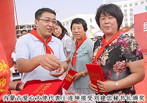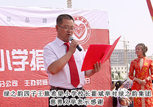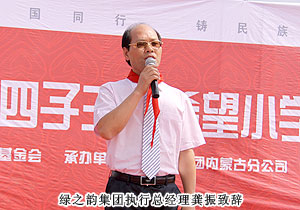 2011年7月20日,位于內(nèi)蒙古自治區(qū)烏蘭察布市的四子王旗熱鬧非凡--綠之韻四子王旗希望小學(xué)在此舉行隆重的捐贈(zèng)儀式。內(nèi)蒙古自治區(qū)青少年發(fā)展基金會(huì)秘書長劉建忠、四子王旗旗委、常務(wù)副旗長蔚代青、政協(xié)副主席于有升、四子王旗工商局局長董明、副局長賈晉峰等政府領(lǐng)導(dǎo)及各界媒體嘉賓蒞臨,綠之韻集團(tuán)董事長胡國安、執(zhí)行總經(jīng)理龔振、綠之韻慈善基金總執(zhí)行戴曉彥不遠(yuǎn)萬里趕赴捐贈(zèng)現(xiàn)場,內(nèi)蒙古分公司經(jīng)理候立新、內(nèi)蒙古地區(qū)愛心大使代表王連坤、郝建兵、張聞?dòng)⒁约?000余名綠之韻愛心大使參與愛心傳遞。