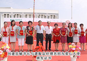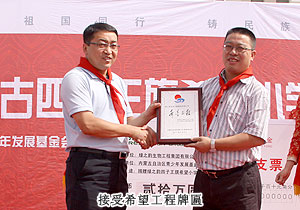 胡國安董事長向內(nèi)蒙古自治區(qū)青基會(huì)秘書長劉建忠遞交二十萬捐贈(zèng)支票,并接受希望工程牌匾。劉建忠秘書長發(fā)表講話,向勇于承擔(dān)社會(huì)責(zé)任的綠之韻集團(tuán)和全體營銷精英致上誠摯敬意。四子王旗常委、常務(wù)副旗長蔚代青與胡國安董事長共同為希望小學(xué)揭牌,并向胡國安董事長頒發(fā)榮譽(yù)市民證書。青基會(huì)秘書長劉建忠和執(zhí)行總經(jīng)理龔振給愛心經(jīng)銷商頒發(fā)證書,整個(gè)活動(dòng)現(xiàn)場人潮洶涌,彌漫著感恩與關(guān)愛,孩子們精彩的節(jié)目表演將揭牌儀式活動(dòng)推向了高潮,現(xiàn)場所有精英心懷感動(dòng),愿意盡自己的能力獻(xiàn)出更多關(guān)愛和溫暖。龔總在致辭中說:在綠之韻八年的發(fā)展中,綠之韻慈善基金在教育、幫扶、救災(zāi)、助學(xué)等方面作出的公益事業(yè)投入累計(jì)已近2000萬元,是每一位愛心綠之韻精英的點(diǎn)滴匯聚才有了公司萬涓成海的善舉。