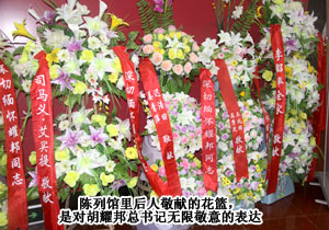 在偉大的無產(chǎn)階級革命家、政治家,原中國共產(chǎn)黨中央委員會總書記胡耀邦故居陳列館里,擺放著大大小小的花籃,那是后人對胡耀邦總書記一生“一身正氣,兩袖清風”無限敬意的表達。中共中央政治局委員、十一屆全國人大常委會副委員長、中華全國總工會主席王兆國,原中華人民共和國中央軍事委員會副主席,國務(wù)委員兼國防部部長遲浩田、中共湖南省委書記、省人大常委會主任周強等領(lǐng)導(dǎo)先后敬獻花籃。胡國安董事長也滿懷對偉大革命家的尊敬之情敬獻花籃,深切緬懷胡耀邦總書記。