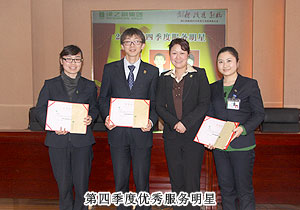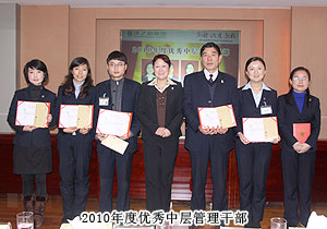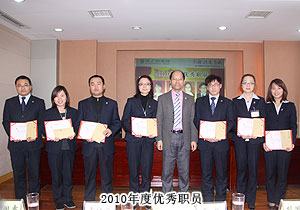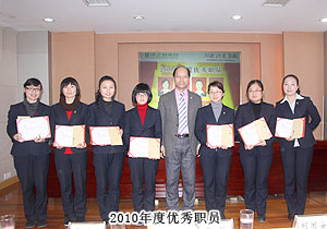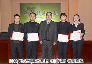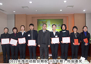 頒獎典禮中,四季度服務(wù)明星、優(yōu)秀服務(wù)集體、年度優(yōu)秀職員、年度優(yōu)秀中層管理干部的表彰讓每一個員工感受到榮譽背后的忠誠、敬業(yè)和專業(yè)。本次頒獎,一份得來不易的殊榮更讓員工們?yōu)閾碛芯G之韻的事業(yè)平臺而驕傲,為表彰鼓勵一直兢兢業(yè)業(yè),勤勤懇懇,愛司如家,對公司發(fā)展做出突出貢獻的優(yōu)秀員工,集團特頒勞動股份期權(quán)獎。本次共有八名優(yōu)秀職員獲2011年度勞動股份期權(quán)(五年期)特別嘉獎,四名優(yōu)秀職員獲2011年度勞動股份期權(quán)(三年期)特別嘉獎。胡國安董事長親自為他們頒獎,并在總結(jié)發(fā)言中表示:或許你現(xiàn)在還離優(yōu)秀差一步,但只要你們再努力,勇敢地向優(yōu)秀邁進,所有表現(xiàn)優(yōu)秀的職員都能在今后的努力中獲此殊榮。同時,胡國安董事長清晰地為員工們規(guī)劃職業(yè)生涯,讓綠之韻的每一位員工都能將才能最大化、價值最大化。