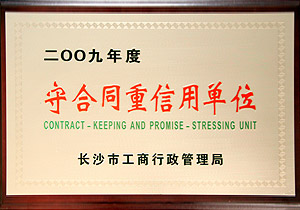 2010年11月3日,長沙市守合同重信用活動總結(jié)暨合同監(jiān)管工作會議在綠之韻集團總部會議室召開,長沙市工商行政管理局副局長謝朝暉、合同處處長李曉紅等領導出席會議。會上,謝朝暉局長為綠之韻集團頒發(fā)2009年長沙市“守合同重信用單位”榮譽牌匾。