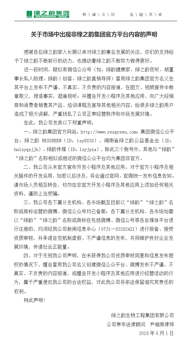 鄭重聲明(關于市場中出現(xiàn)非綠之韻集團官方平臺內(nèi)容的聲明)