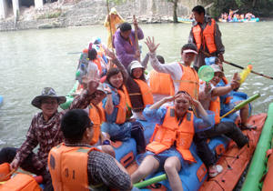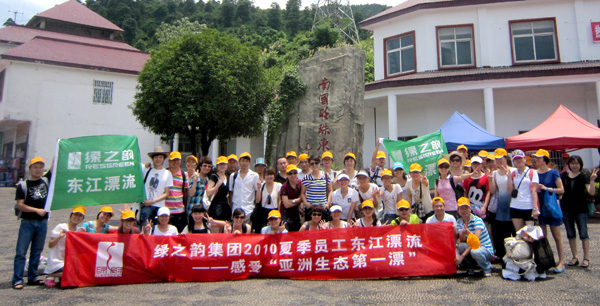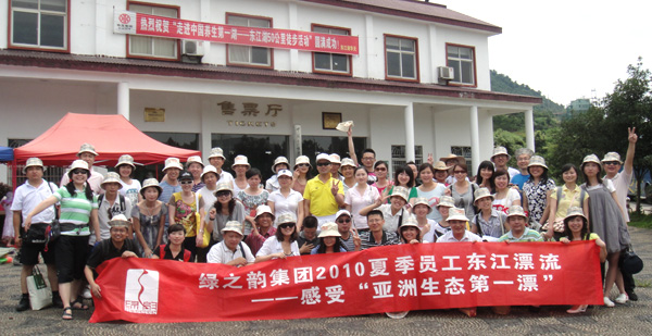 旅游途中,不僅參觀了霧漫小東江、猴古山瀑布、東江大壩等景點,大伙也嘗到了東江湖特產(chǎn)的各色美味,在美麗的景色前爭相合影,把綠之韻人的快樂和輕松留在了他鄉(xiāng)。此次旅游的目的地東江漂流是最刺激的項目(全長28公里,落差75米,途經(jīng)108個急險灘),同事們積極購置了水槍、水瓢、水盆、雨衣等備戰(zhàn)工具,當(dāng)大家到達起漂點,邊穿救生衣邊潑水,一場激烈的水戰(zhàn)在此起彼伏的尖叫和歡笑聲中拉開序幕。順流而下,河段兩岸青山疊翠,珍稀花草爭妍斗艷,原始森林相擁對峙,怪石林立,水質(zhì)清澈,給人以探幽、獵奇、拾趣之樂,同事們盡情地領(lǐng)略著博浪飛舟的激越、高歌揮槳的豪放。