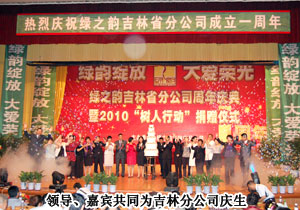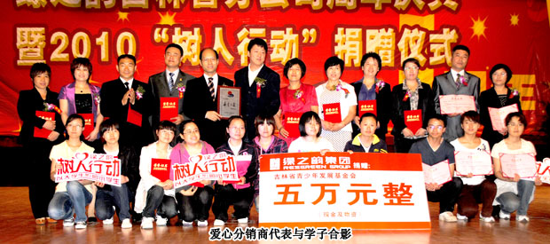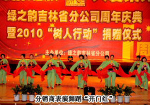 2010年5月29日,綠之韻吉林分公司喜迎“綠韻綻放?大愛(ài)榮光”一周年慶典暨“綠之韻樹(shù)人行動(dòng)”捐贈(zèng)儀式。綠之韻集團(tuán)執(zhí)行總經(jīng)理龔振、吉林分公司經(jīng)理劉曉桅與1000多名分銷(xiāo)精英共同為吉林分公司點(diǎn)亮生日蠟燭,歡樂(lè)慶生!同時(shí),吉林省青少年發(fā)展基金會(huì)部長(zhǎng)王超與東北師范大學(xué)10名品學(xué)兼優(yōu)的貧困學(xué)子列席會(huì)議,接受吉林分公司10名愛(ài)心分銷(xiāo)商5萬(wàn)元人民幣的愛(ài)心捐贈(zèng)。
