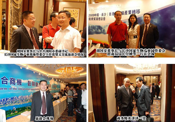 2009年5月18-20日,2009中國・長沙(香港)承接產(chǎn)業(yè)轉(zhuǎn)移投資貿(mào)易懇談會在香港舉行。胡國安董事長應(yīng)長沙市政府邀請,出席此次懇談會。會上,長沙代表團發(fā)布的總投資達230.4億美元的80個重大項目,引起與會300多位香港各界名流的廣泛關(guān)注。中共長沙市委副書記、市長張劍飛和與會嘉賓代表共同推動了象征加快發(fā)展的“引擎”,喻示著長沙與香港的經(jīng)貿(mào)合作從此進入“快車道”。