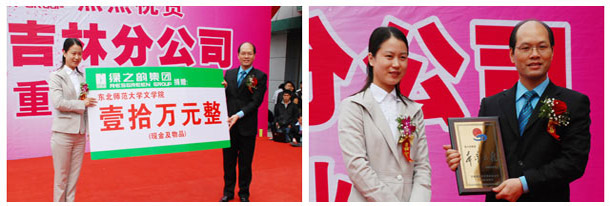 在綠之韻集團吉林分公司開業(yè)慶典現(xiàn)場,十名手持愛心捐贈牌匾的大學生十分引人注目,他們是由吉林省青少年發(fā)展基金會甄選出來的品學兼優(yōu)但家境貧困的大學生、“綠之韻樹人行動”首批資助對象十名——八名東北師范大學的貧困大學生以及兩名綠之韻吉林分銷商子弟。綠之韻慈善基金預(yù)計總投資一千萬開展的“綠之韻樹人行動”已正式啟動,這也意味著綠之韻集團一直秉承的“關(guān)愛生命、造福人類” 的理念、助人為樂的精神再一次得到實現(xiàn)及升華。
