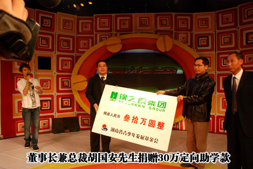 該節(jié)目聯(lián)合愛心企業(yè)籌集善款為貧困山區(qū)捐贈(zèng)希望小學(xué)的欄目宗旨正與綠之韻集團(tuán)公司愛心助學(xué)的理念不謀而合,引起了集團(tuán)公司領(lǐng)導(dǎo)的關(guān)注,并最終促成了此次的合作,這也是該欄目首次推出湖南省外的希望小學(xué)捐贈(zèng)活動(dòng)。綠之韻集團(tuán)董事長(zhǎng)兼總裁胡國(guó)安親臨節(jié)目現(xiàn)場(chǎng)將30萬元現(xiàn)金支票捐贈(zèng)到湖南省青少年發(fā)展基金會(huì)副秘書長(zhǎng)李秋林以及孟憲臣校長(zhǎng)手中。胡總說:“捐贈(zèng)38所綠之韻希望學(xué)校是所有綠之韻人的追求,三年以來,集團(tuán)公司投入在慈善公益方面的款項(xiàng)累計(jì)已達(dá)500多萬,在以后的日子里,我們?nèi)詫⒉粩嗟臑楦黜?xiàng)社會(huì)公益活動(dòng)奉獻(xiàn)愛心,幫助更多需要幫助的人,在勇往直前的事業(yè)發(fā)展途中,讓愛見證每一位綠之韻人的情懷。