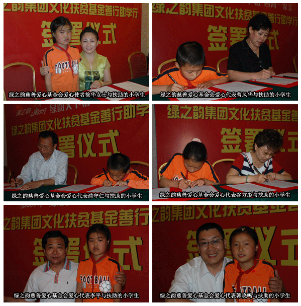 2007年5月19日晚上9:00,湖南長(zhǎng)沙天璽大酒店四樓會(huì)議廳,綠之韻集團(tuán)公司領(lǐng)導(dǎo)及7位綠之韻慈善愛心基金會(huì)代表成員和來自貧困山區(qū)湘西古丈紅樹林小學(xué)的6名貧困家庭的小學(xué)生齊聚一堂,舉行綠之韻慈善愛心基金會(huì)善行認(rèn)領(lǐng)簽署儀式。綠之韻集團(tuán)董事常務(wù)副總經(jīng)理勞嘉女士為此次儀式致詞,綠之韻慈善愛心基金會(huì)愛心代表谷方彤女士及小學(xué)生代表彭艷琴分別做了感人至深的發(fā)言。
