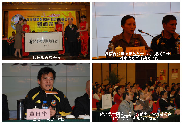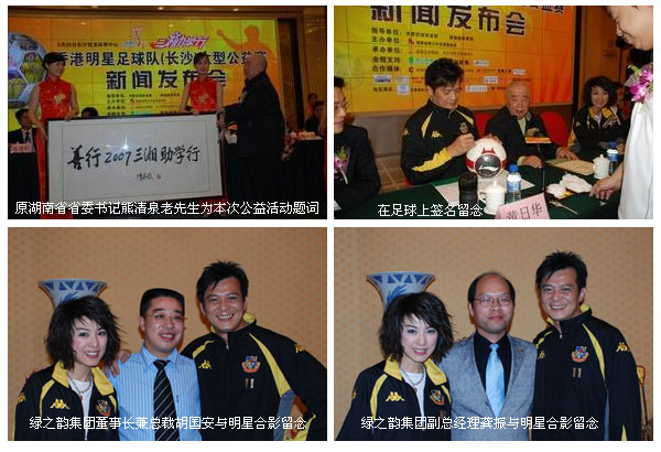 2007年4月26日下午三點,由湖南省青少年發(fā)展基金會主辦,綠之韻集團全程支持的“綠之韻杯善行2007·綠之韻三湘助學行”香港明星足球隊(長沙)大型公益賽新聞發(fā)布會在華雅國際大酒店隆重召開。原湖南省省委書記熊清泉擔任活動名譽顧問,共青團湖南省團委副書記張值恒、湖南省體育局副局長熊倪等出席了新聞發(fā)布會,綠之韻集團董事長兼總裁胡國安先生、香港明星足球隊領隊及代表黃日華、米雪、尹志強和湖南愛心聯隊領隊王可維出席會議并分別發(fā)表講話。湖南省的電視、報紙、雜志、電臺、網絡等30多家媒體到現場采訪。綠之韻集團第三屆(分銷商)咨詢管理委員會的50多位候補委員們亦受邀參加新聞發(fā)布會為活動助興。