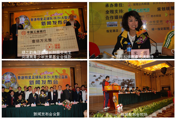 新聞發(fā)布會上,湖南省青少年發(fā)展基金會秘書長劉鳳娟對本次賽事進行了簡要介紹,并重點就綠之韻集團熱心公益的慈善義舉表示贊許。本次公益賽事活動定于2007年5月20日下行三點在長沙市賀龍體育中心舉行,香港隊將由譚詠麟、曾志偉、任達華等明星領銜出場,對決由綠之韻集團組成的綠之韻愛心聯隊,本次活動心系貧困兒童,關注山區(qū)教育事業(yè),綠之韻集團所籌善款將全部贈予湖南省青少年發(fā)展基金會,致力于幫助全國各地貧困兒童重回課堂。