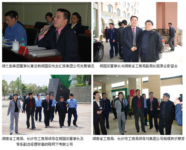 2007年4月11日,湖南省工商局副局長寇勇、李沐,長沙市工商局局長陳躍文等帶領(lǐng)省、市工商局市場處、外資處、商標廣告監(jiān)督管理處、注冊局等40余名領(lǐng)導深入湖南瀏陽生物醫(yī)藥園,對公司進行了調(diào)研考察。省、市工商局調(diào)研組一行首先在瀏陽生物醫(yī)藥園管委會政務廳聽取了瀏陽工商局、管委會領(lǐng)導以及綠之韻集團董事長兼總裁胡國安先生的工作匯報。