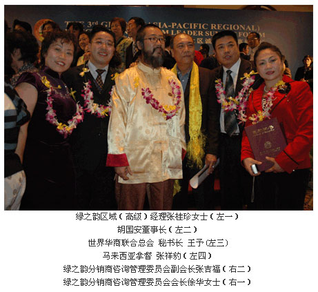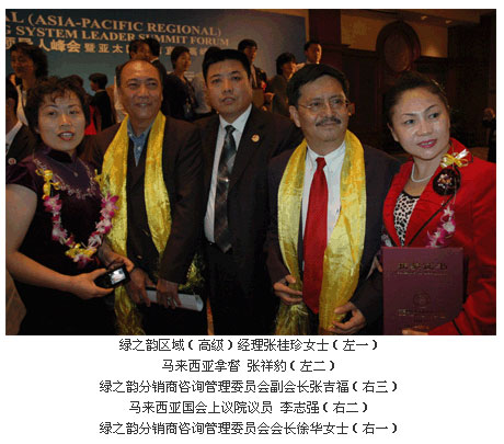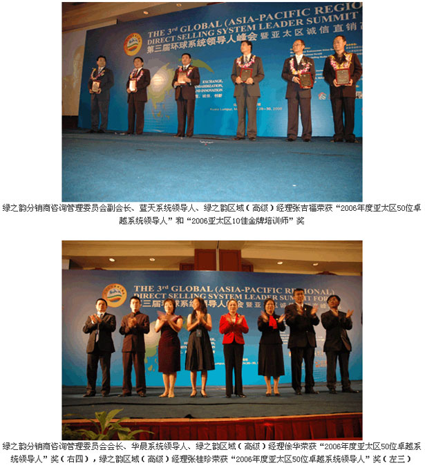 這次峰會(huì),綠之韻公司捷報(bào)頻傳,綠之韻集團(tuán)分銷商(咨詢)管理委員會(huì)會(huì)長、綠之韻華晨系統(tǒng)領(lǐng)導(dǎo)人徐華、綠之韻集團(tuán)分銷商(咨詢)管理委員會(huì)副會(huì)長、綠之韻藍(lán)天系統(tǒng)領(lǐng)導(dǎo)人張吉福、綠之韻集團(tuán)分銷商(咨詢)管理委員會(huì)執(zhí)行秘書長劉國立、綠之韻區(qū)域(高級)經(jīng)理張桂珍同時(shí)榮獲“2006亞太區(qū)50位卓越系統(tǒng)領(lǐng)導(dǎo)人”稱號(hào)。同時(shí)“2006亞太區(qū)十佳金牌培訓(xùn)講師”這一榮譽(yù)稱號(hào)也被綠之韻藍(lán)天系統(tǒng)領(lǐng)導(dǎo)人張吉福獲得。這些來自頂級專業(yè)峰會(huì)的權(quán)威獎(jiǎng)勵(lì)為綠之韻走向更好更快的走向國際奠定了基礎(chǔ)。