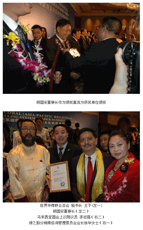 此次風(fēng)云聚會(huì),綠之韻集團(tuán)憑借其三年多來在業(yè)界的出色表現(xiàn)及在直銷法規(guī)框架內(nèi)銳意創(chuàng)新的特色營銷模式,榮獲第三屆環(huán)球系統(tǒng)領(lǐng)導(dǎo)人峰會(huì)暨亞太區(qū)誠信高峰論壇“2006亞太區(qū)10佳創(chuàng)新營銷模式范例企業(yè)”大獎(jiǎng)。集團(tuán)公司董事長兼總裁胡國安先生不但作為此次峰會(huì)的特約嘉賓為獲得“2006亞太區(qū)最具品牌競爭力十佳保健品”稱號(hào)的代表頒獎(jiǎng),更因其在推動(dòng)和諧社會(huì)健康發(fā)展系列事業(yè)及活動(dòng)中的卓越表現(xiàn),被世界和諧促進(jìn)會(huì)授予“世界和諧文化使者稱號(hào)”稱號(hào)。在獲獎(jiǎng)感言中胡國安董事長表示:推動(dòng)和諧社會(huì)發(fā)展是綠之韻公司永遠(yuǎn)的事業(yè),“共祈世界和諧進(jìn)步,同助人類健康幸福”也將是綠之韻公司的永恒追求,不但是自己,所有綠之韻精英都將會(huì)為“實(shí)現(xiàn)人類同一愿望——共鑄和諧社會(huì),共同承載人類同一責(zé)任——同創(chuàng)世界和平”事業(yè)繼續(xù)努力。