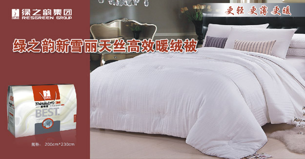 綠之韻集團(tuán)與世界500強(qiáng)企業(yè)3M公司強(qiáng)強(qiáng)聯(lián)手推出高科技被芯——綠之韻新雪麗天絲高效暖絨被。此款被芯使用的是市場上熱重效率最高的合成保溫材料,利用被芯形成具有高吸附空氣性能的空間結(jié)構(gòu),從而阻止人體熱量通過空氣對流散失,同時(shí)反射回大部分的人體熱輻射,這樣就保障了人體熱量盡可能少的損失。且3M公司的新雪麗保溫材料就是為了可以承受地球上最苛刻的環(huán)境條件才研制出來的,因此從它誕生起就比一般的保溫材料更保暖。實(shí)驗(yàn)證明,在相同重量的情況下,要多550克羽絨作為填充料,才能達(dá)到這樣一款新雪麗暖絨被的保暖效果,這也直接解決冬天蓋被臃腫的難題。