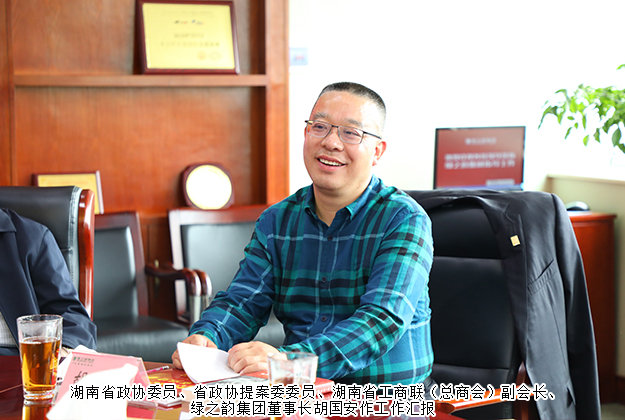2020年3月26日,湖南省政協(xié)副主席張大方、省政協(xié)副秘書長陳宏忠、省政協(xié)提案委主任袁海平、省政協(xié)人資環(huán)委主任李壯麗一行蒞臨綠之韻集團(tuán)調(diào)研指導(dǎo);瀏陽經(jīng)開區(qū)黨工委委員、管委會副主任何六生陪同調(diào)研。湖南省政協(xié)委員、省政協(xié)提案委委員、湖南省工商聯(lián)(總商會)副會長、綠之韻集團(tuán)董事長胡國安,湖南省工商聯(lián)女商會常務(wù)副會長、瀏陽市工商聯(lián)副主席、綠之韻集團(tuán)董事總裁勞嘉,副總裁胡均安,黨委書記劉云等公司領(lǐng)導(dǎo)全程陪同。