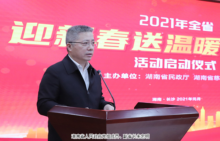 隨后,湖南省人民政府黨組成員、副省長朱忠明講話。他首先代表省民政廳向慷慨捐贈的愛心企業(yè)致以崇高的敬意,對長期以來關心支持民政事業(yè)、關心愛護困難群眾的社會愛心人士表示衷心的感謝。他強調,各級部門要認真貫徹落實省委省政府的決策部署,全力保障人民群眾的基本生活,確保困難群眾不受凍、不挨餓,溫暖過冬。對此他提出三點要求:一要提高政治站位,高度重視,扶危濟困;二要加強宣傳引導,大力營造良好氛圍;三要整合資源,廣泛凝聚愛心合力,用實際行動幫助困難群眾歡度春節(jié),創(chuàng)造美好未來。