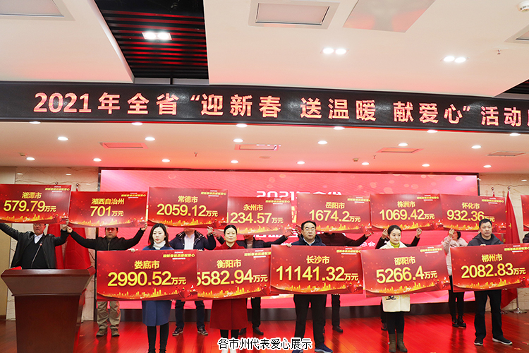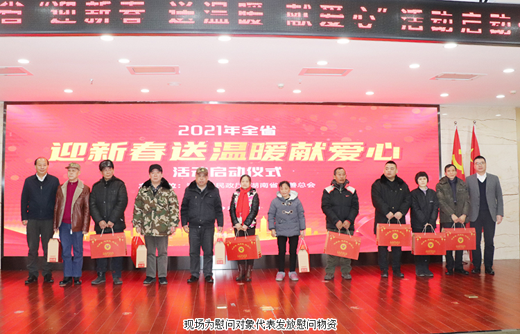 啟動儀式上,各市州代表就“迎新春 送溫暖 獻愛心”活動的開展情況上臺進行了展示。愛心企業(yè)代表紛紛慷慨解囊,舉牌捐贈。湖南省綠之韻公益基金會現(xiàn)場捐贈200萬元款物幫扶困難群體歡度春節(jié)。湖南省民政廳一級巡視員楊薇接受愛心企業(yè)捐贈。湖南省民政廳黨組成員、副廳長張自銀為綠之韻等愛心企業(yè)頒發(fā)捐贈證書。湖南省人民政府副秘書長季心詮,湖南省民政廳黨組書記、廳長曹忠平現(xiàn)場為慰問對象代表發(fā)放慰問物資。
