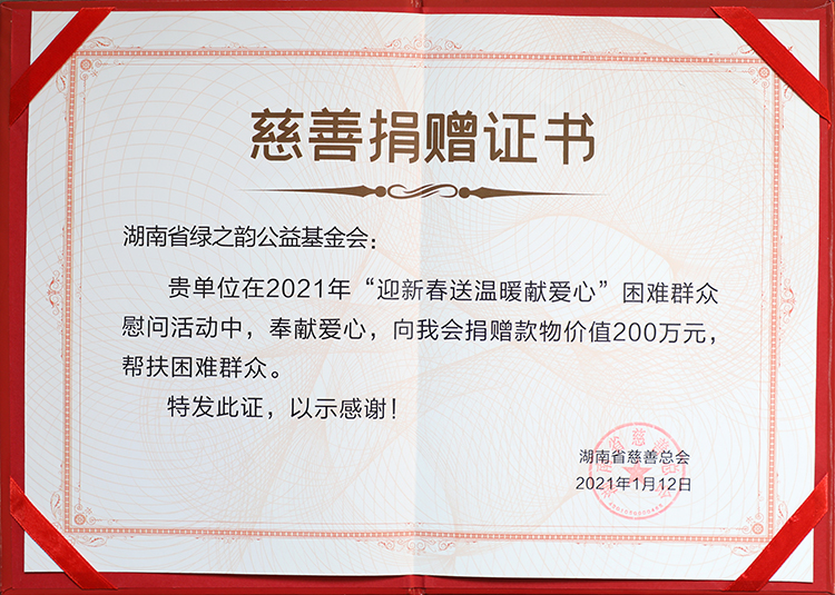 綠之韻集團董事總裁、湖南省綠之韻公益基金會理事長勞嘉表示,綠之韻走過十八年的愛心之旅,在發(fā)展實業(yè)的同時,深度參與脫貧攻堅,積極承擔社會責任,不斷與時俱進創(chuàng)新公益幫扶模式,以最大的力度、廣度和深度助力新時代人民群眾對美好生活的向往和美麗鄉(xiāng)村建設。湖南省綠之韻公益基金會已經連續(xù)多年參加全省“迎新春 送溫暖 獻愛心”活動,2020年春節(jié)至今累計捐贈款物近200萬元,通過多種方式積極援助湖北湖南抗擊疫情,先后收到了省委省政府、省委統(tǒng)戰(zhàn)部、致公黨湖南省委、省工商聯(lián)、省慈善總會、長沙市委市政府、益陽市委市政府發(fā)來的感謝信。此次,綠之韻再度向湖南慈善總會捐贈200萬元款物,用于對貧困地區(qū)困難群眾的幫扶慰問。近日,憑借在抗擊新冠肺炎疫情中做出的重要貢獻,公司被全國工商聯(lián)授予 “抗擊新冠肺炎疫情先進民營企業(yè)”稱號。未來,綠之韻將匯聚更多公益力量,號召更多的社會愛心人士,共同參與到“迎新春 送溫暖 獻愛心”活動中,以實際行動承擔起企業(yè)的社會責任,用愛心和善行助力富饒美麗幸福新湖南建設。