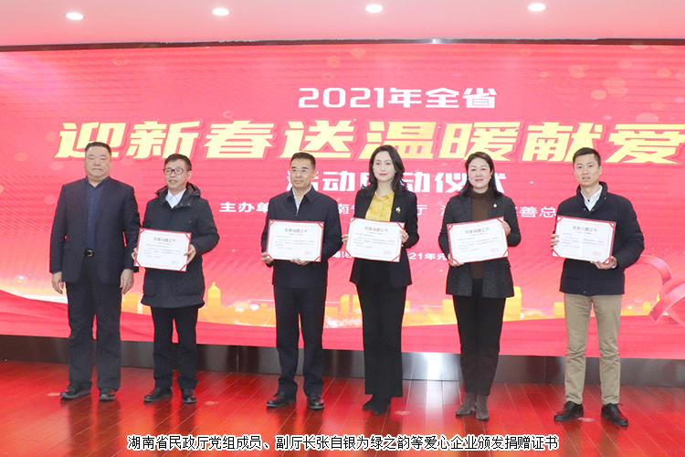 公益?zhèn)鬟f溫暖,愛心回饋社會。2021年1月12日,湖南省“迎新春 送溫暖 獻愛心”活動啟動儀式在湖南省民政廳舉行。湖南省人民政府黨組成員、副省長朱忠明,省人民政府副秘書長季心詮,省民政廳黨組書記、廳長曹忠平,省民政廳黨組成員、副廳長張自銀,省民政廳一級巡視員楊薇等領導出席活動。綠之韻集團董事總裁、湖南省綠之韻公益基金會理事長勞嘉出席活動,并代表湖南省綠之韻公益基金會向湖南省慈善總會捐贈200萬元款物參與幫扶貧困群眾。綠之韻集團總裁助理、湖南省綠之韻公益基金會秘書長蔣文及各市州代表、媒體代表、10名慰問對象代表參加活動。