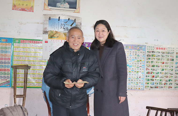 任惠老公患重病過世,她既要照顧家中七十八歲的爺爺,還要拉拔著兩個上小學(xué)的兒子,生活給予了十分的艱難,但年輕的任慧卻比想象中堅強得多。慰問組一行來到家中時,她張羅著讓大家坐著喝茶,孩子們在旁邊無憂無慮地玩耍。勞嘉理事長為她送上慰問金,鼓勵她:生活的困難打不倒每一個堅強的母親,孩子們就是未來的希望!任惠的笑容就像她的藍(lán)色外套一樣,為灰色的生活添上了一抹亮色!