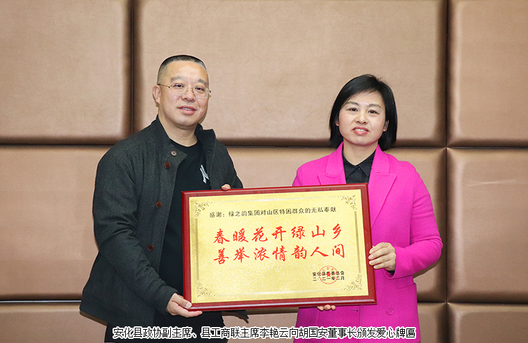 捐贈儀式在安化縣民政局辦公樓舉行?;顒右潦迹不h慈善總會副會長兼秘書長游建明介紹了目前安化慈善工作的發(fā)展情況。他在介紹中對胡國安董事長飲水思源、回饋家鄉(xiāng)的善舉,對綠之韻集團精準扶貧、回報桑梓的高尚情操表示了高度的肯定與贊許。他表示,安化縣慈善總會將秉承“陽光慈善,誠信慈善,放心慈善”的原則,??顚S?,科學制定方案,精準幫扶對象,確保把胡國安董事長的愛心落到實處。隨后,胡國安董事長向安化慈善總會捐贈20萬元現(xiàn)金支票。安化縣政協(xié)副主席、縣工商聯(lián)主席李艷云向胡國安董事長頒發(fā)了愛心捐贈牌匾。