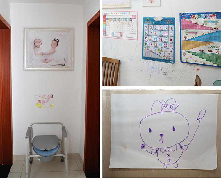 年輕的楊芳是一對雙胞胎女兒的媽媽??粗[瞇的笑眼,你感覺不到雙胞胎媽媽背后的辛苦。兩個女兒2014年出生,其中一個小孩患有先天性腦發(fā)育不良癥狀,孩子的治療和康復(fù)費用相當(dāng)高。楊芳辭去了原本的工作,專心在家照顧孩子,孩子們到了上學(xué)年齡,楊芳也是風(fēng)雨無阻接送。家里主要經(jīng)濟收入來源就是愛人打零工,因為家庭具體情況,楊芳愛人也只能在家附近做工方便照顧。盡管家中確實困難,但是父母的愛只多不少。走訪那天恰逢楊芳兩個女兒過生日,家里用氣球布置得十分溫馨,楊芳笑著說:孩子們期待了很久,想要邀請同學(xué)來家里玩。都說孩子們的生日是母親的受難日,楊芳卻覺得,孩子就是她生命中最珍貴的禮物。