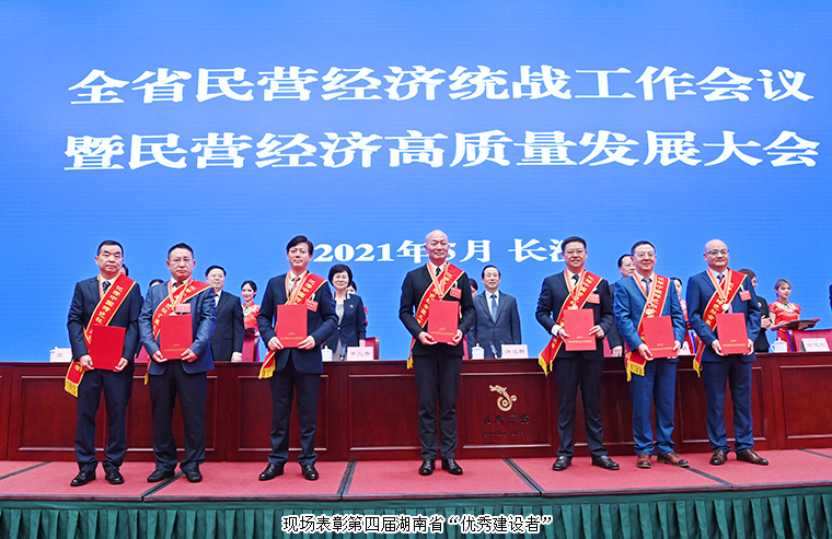 2021年5月28日下午,湖南省民營(yíng)經(jīng)濟(jì)統(tǒng)戰(zhàn)工作會(huì)議暨民營(yíng)經(jīng)濟(jì)高質(zhì)量發(fā)展大會(huì)在長(zhǎng)沙召開(kāi)。會(huì)議深入學(xué)習(xí)貫徹習(xí)近平總書記關(guān)于民營(yíng)經(jīng)濟(jì)的重要講話指示精神,全面落實(shí)關(guān)于加強(qiáng)新時(shí)代民營(yíng)經(jīng)濟(jì)統(tǒng)戰(zhàn)工作的意見(jiàn)和全國(guó)民營(yíng)經(jīng)濟(jì)統(tǒng)戰(zhàn)工作會(huì)議精神,表彰第四屆湖南省“優(yōu)秀建設(shè)者”,交流民營(yíng)經(jīng)濟(jì)統(tǒng)戰(zhàn)工作經(jīng)驗(yàn),為促進(jìn)民營(yíng)經(jīng)濟(jì)高質(zhì)量發(fā)展、建設(shè)現(xiàn)代化新湖南凝心聚力。