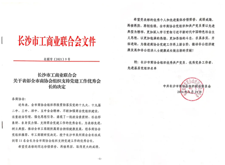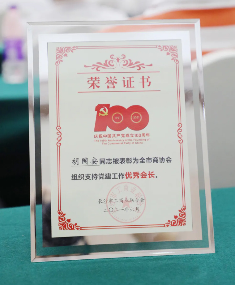 此次榮獲“支持商會(huì)黨建工作優(yōu)秀會(huì)長”,胡國安董事長表示,既是榮譽(yù),也是一份沉甸甸的責(zé)任。自2017年長沙市安化商會(huì)成立以來,作為商會(huì)會(huì)長,他攻堅(jiān)克難,盡職盡責(zé),主動(dòng)承擔(dān)社會(huì)責(zé)任,積極參與并引導(dǎo)廣大會(huì)員共同參與到精準(zhǔn)脫貧、鄉(xiāng)村振興、光彩事業(yè)和社會(huì)公益事業(yè)。未來,他將繼續(xù)充分發(fā)揮會(huì)長作用,認(rèn)真學(xué)習(xí)和貫徹黨的路線、方針、政策;積極履職盡責(zé),不斷推進(jìn)商會(huì)工作的規(guī)范化、制度化和創(chuàng)新發(fā)展,切實(shí)提高商會(huì)工作效率和服務(wù)水平,吸納更多的安化籍優(yōu)秀企業(yè)家入會(huì),把長沙市安化商會(huì)打造成具有地方特色的知名商會(huì),為省市經(jīng)濟(jì)發(fā)展貢獻(xiàn)出商會(huì)力量。