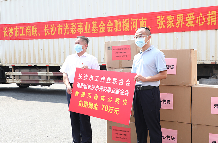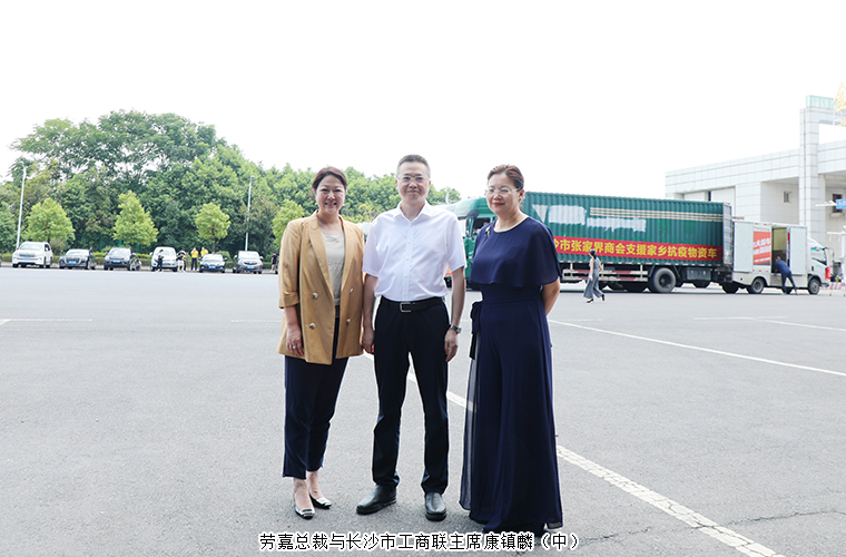 2021年8月6日,長(zhǎng)沙市工商業(yè)聯(lián)合會(huì)、長(zhǎng)沙市光彩事業(yè)基金會(huì)舉行馳援河南、張家界愛(ài)心捐贈(zèng)活動(dòng)。中共長(zhǎng)沙市委常委、統(tǒng)戰(zhàn)部部長(zhǎng)譚小平,長(zhǎng)沙市工商聯(lián)主席康鎮(zhèn)麟,中共長(zhǎng)沙市委統(tǒng)戰(zhàn)部副部長(zhǎng)、市工商聯(lián)黨組書(shū)記何惠風(fēng)等領(lǐng)導(dǎo)出席捐贈(zèng)儀式。長(zhǎng)沙市工商聯(lián)副會(huì)長(zhǎng)、綠之韻集團(tuán)董事總裁、湖南省綠之韻公益基金會(huì)理事長(zhǎng)勞嘉參加捐贈(zèng)活動(dòng)。