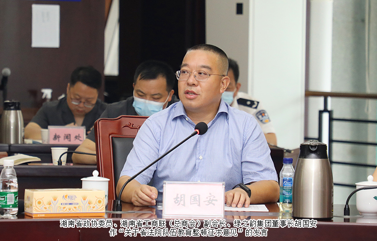 2021年8月24日,為廣泛聽取社會各界對法院工作和法院隊伍的意見建議,切實提升省法院隊伍教育整頓工作成效,湖南省高級人民法院隊伍教育整頓座談會在長沙召開。湖南省高級人民法院黨組書記、院長田立文,黨組副書記、副院長鄔文生,省紀委省監(jiān)委駐省法院紀檢監(jiān)察組組長、省法院黨組成員粟志遠,黨組成員、政治部主任董嵐等領(lǐng)導出席會議。湖南省政協(xié)委員、湖南省工商聯(lián)(總商會)副會長、綠之韻集團董事長胡國安受邀參加會議。