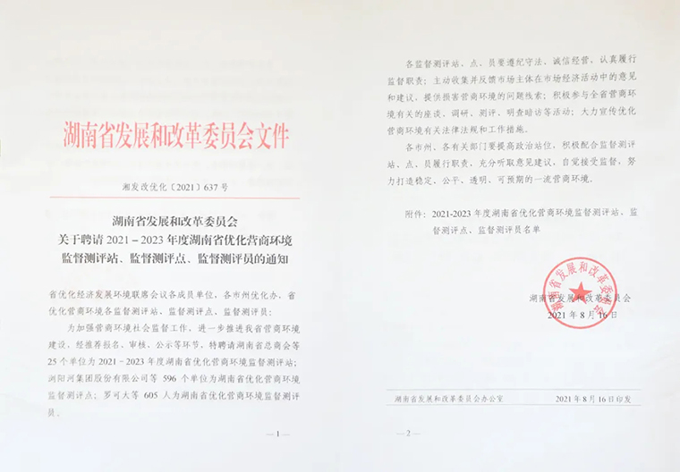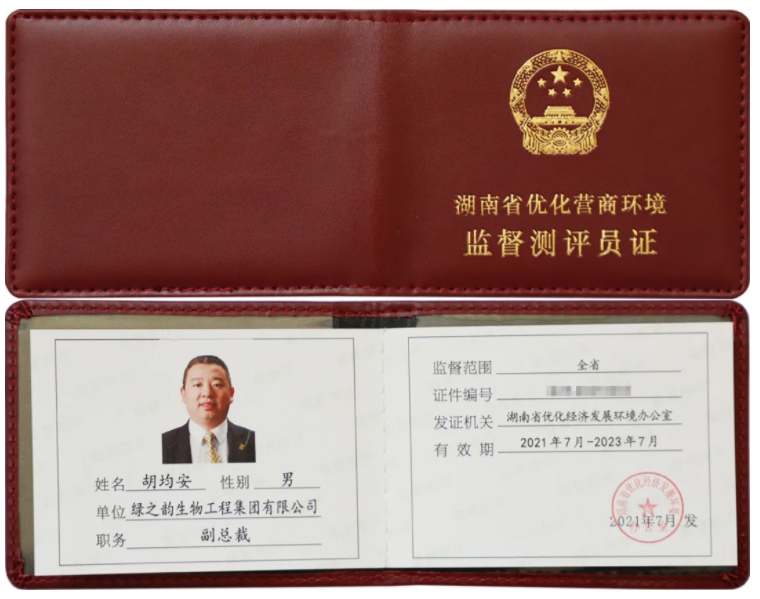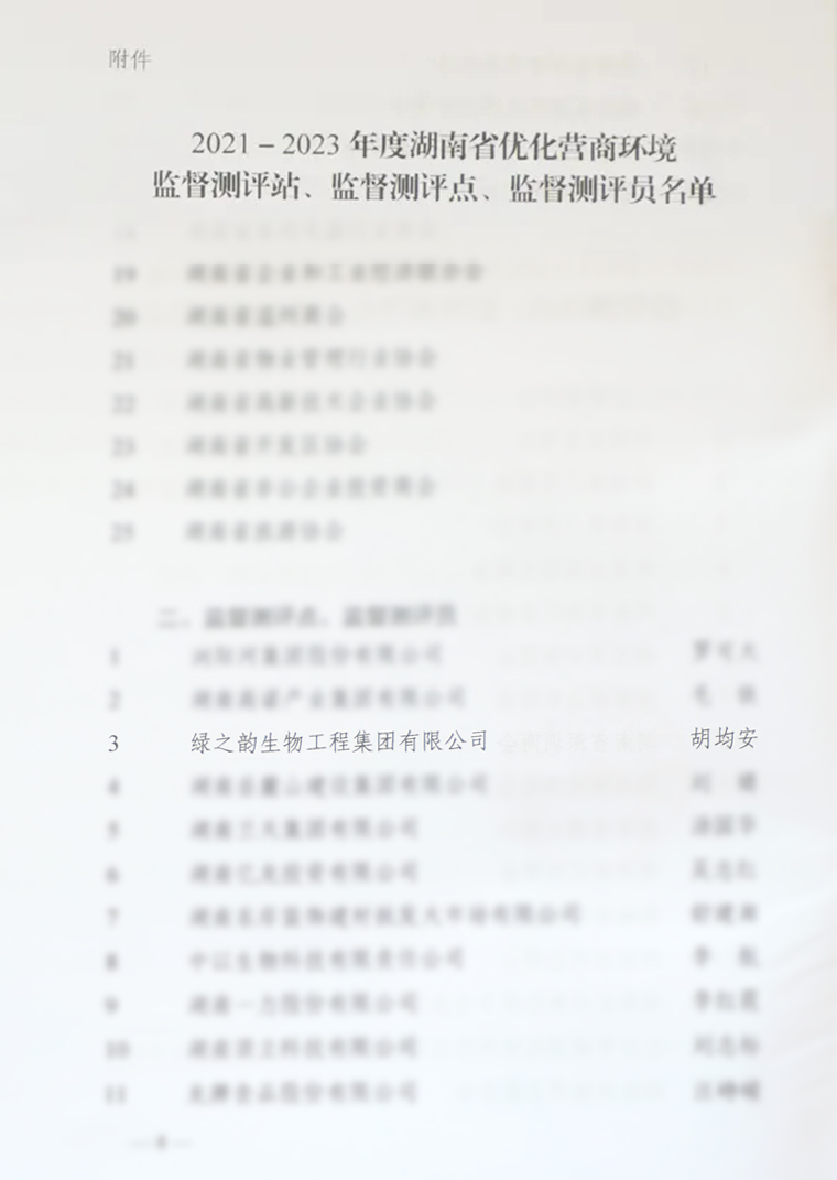 為加強(qiáng)營商環(huán)境社會(huì)監(jiān)督工作,進(jìn)一步推進(jìn)我省營商環(huán)境建設(shè),經(jīng)企業(yè)申請(qǐng)和單位推薦報(bào)名,通過相關(guān)部門審核和公示公開,經(jīng)湖南省優(yōu)化經(jīng)濟(jì)發(fā)展環(huán)境聯(lián)席會(huì)議辦公室研究,綠之韻集團(tuán)獲評(píng)“2021-2023年度湖南省優(yōu)化營商環(huán)境監(jiān)督測評(píng)點(diǎn)”,綠之韻集團(tuán)副總裁胡均安獲評(píng)“湖南省優(yōu)化營商環(huán)境監(jiān)督測評(píng)員”。
