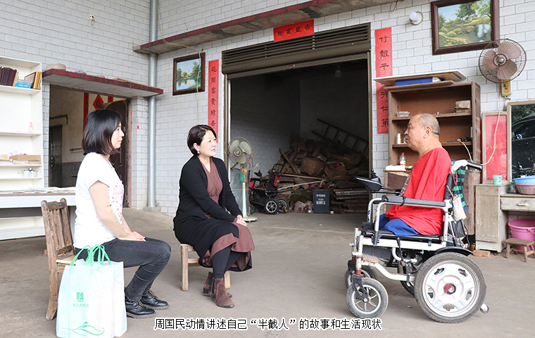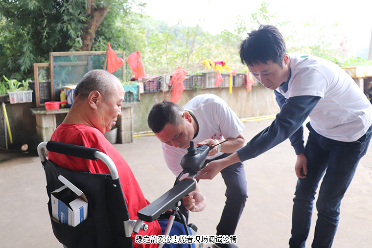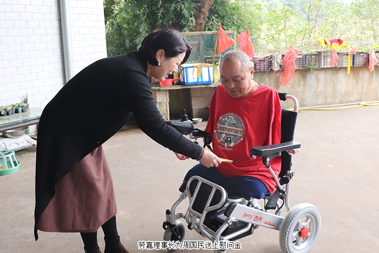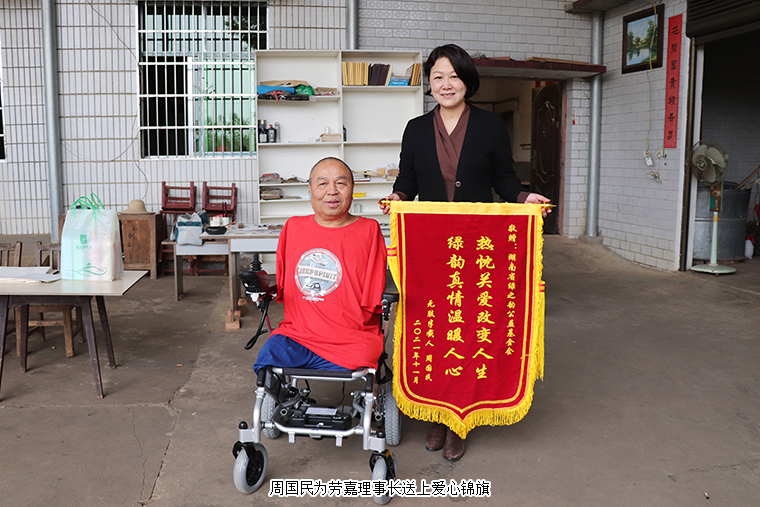 輪椅就是日日夜夜陪伴周國(guó)民的“老伙計(jì)”,這幾年風(fēng)里來雨里去,經(jīng)過了補(bǔ)胎、換電瓶等各種維修,原來這臺(tái)輪椅也終是要“退休”了。因?yàn)閯诩卫硎麻L(zhǎng)送來的新輪椅,他無法用言語來表達(dá)內(nèi)心的感動(dòng)。每年,綠之韻公益基金會(huì)志愿者都會(huì)去看望他,送上慰問金,還為方便他們家人的生活,添置了電飯煲、電磁爐和微波爐等家用電器。他幾次找到基金會(huì),拜托工作人員為他做一面錦旗,他希望盡可能表達(dá)出內(nèi)心的感恩。勞嘉理事長(zhǎng)陪著他試乘新輪椅,周國(guó)民也不住地感謝:“家人的支撐讓我熬過了生命的最灰暗,世間的愛心讓我感受到人生不受限,處處有希望。感謝胡總和勞總,感謝綠之韻,希望好人一生平安?!?