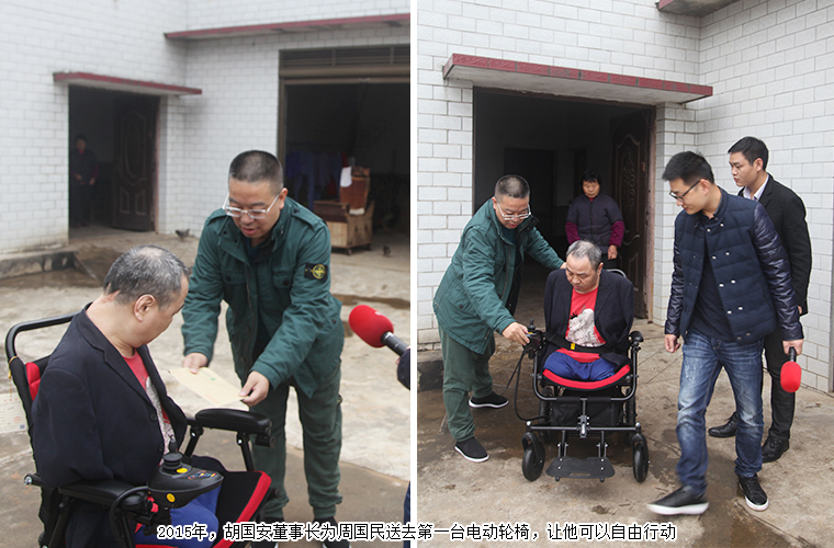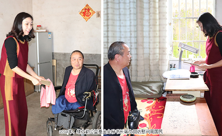 六年前,胡國(guó)安董事長(zhǎng)為“半截人”畫家周國(guó)民送去了電動(dòng)輪椅,把四肢殘疾的他從木制手工輪椅當(dāng)中解放出來,實(shí)現(xiàn)了他自由行動(dòng)的夢(mèng)想。2021年11月15日,綠之韻公益基金會(huì)理事長(zhǎng)勞嘉再次為周國(guó)民送去了新的電動(dòng)輪椅。周國(guó)民難掩激動(dòng),“綠之韻改變了我的殘缺人生,讓我半截人生里多了更多希望?!?