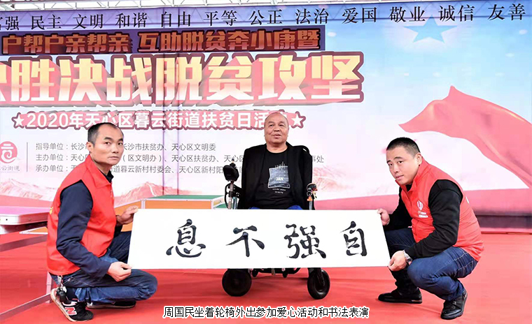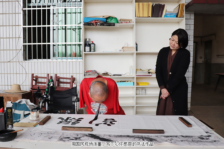 離開前,周國(guó)民在勞嘉理事長(zhǎng)幫助下?lián)]毫潑墨,寫下了《綠韻大愛》的書法作品。揮灑的汗水、真誠(chéng)的笑容、動(dòng)人的身影就如這秋日暖陽,在寒冷季節(jié)到來之前尤為珍貴。我們希望,命運(yùn)奪走了他的部分軀體,愛讓他的人生不再殘缺。