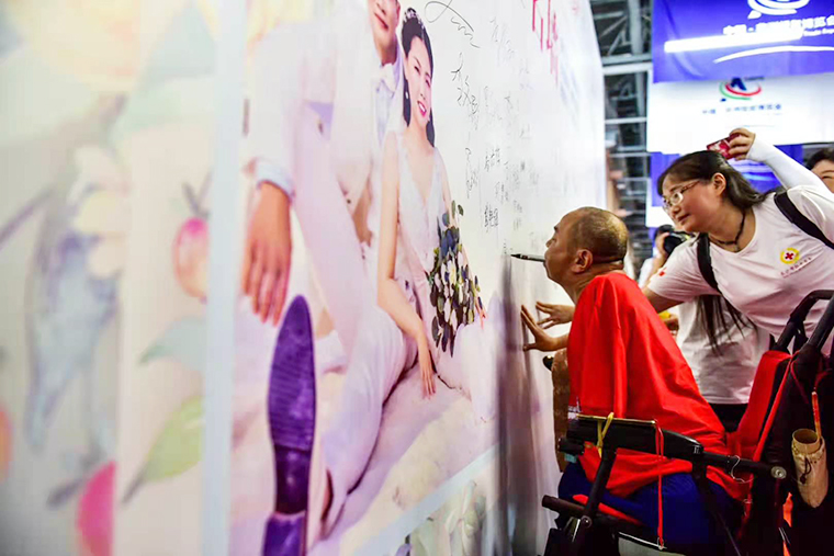 康復(fù)過程的煎熬與苦痛,現(xiàn)在的他已經(jīng)可以平靜敘述。6年中大大小小手術(shù)進(jìn)行康復(fù)治療,重新坐起來;3年時(shí)間不斷練習(xí)和自理,學(xué)會(huì)用口含筆寫書法,重新建立人生信心;10年后,他定下了新的人生目標(biāo),不僅要照顧好自己和家人,還希望可以幫助到跟他一樣有需求的殘疾人。
