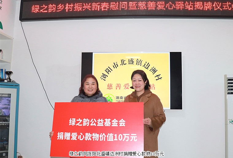 春節(jié)慰問送溫暖,暖冬關愛顯真情。2022年1月13日,綠之韻鄉(xiāng)村振興建設暨新春慰問活動走進瀏陽北盛鎮(zhèn)邊洲村。綠之韻再次向邊洲村捐贈10萬元愛心款物,主要用于邊洲村鄉(xiāng)村振興建設和困難群眾新春慰問等,并與村委共建慈善愛心驛站,希望影響更多的愛心企業(yè)和人士來到愛心驛站奉獻愛心,輸送溫暖。