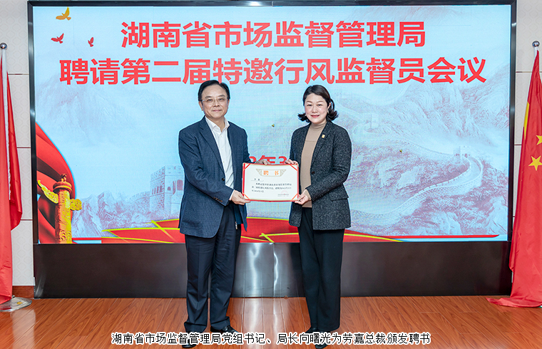湖南省市場監(jiān)督管理局黨組成員、省藥監(jiān)局黨組書記梁毅恒宣讀了《關(guān)于省局干部隊(duì)伍作風(fēng)紀(jì)律教育整頓總體情況的通報(bào)》。湖南省市場監(jiān)督管理局副局長李沐宣讀聘請?zhí)匮酗L(fēng)監(jiān)督員的通知。勞嘉總裁受聘為湖南省市場監(jiān)督管理局第二屆特邀行風(fēng)監(jiān)督員。